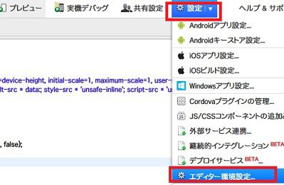①上部メニューから「設定」→「エディタ設定環境」を押します。